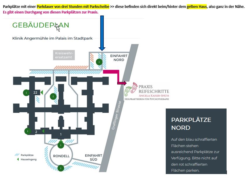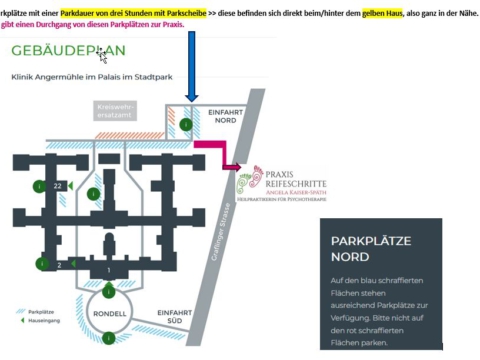 Bitte benutzen Sie die Parkplätze die gekennzeichnet sind mit einer „Parkdauer von drei Stunden mit Parkscheibe“.